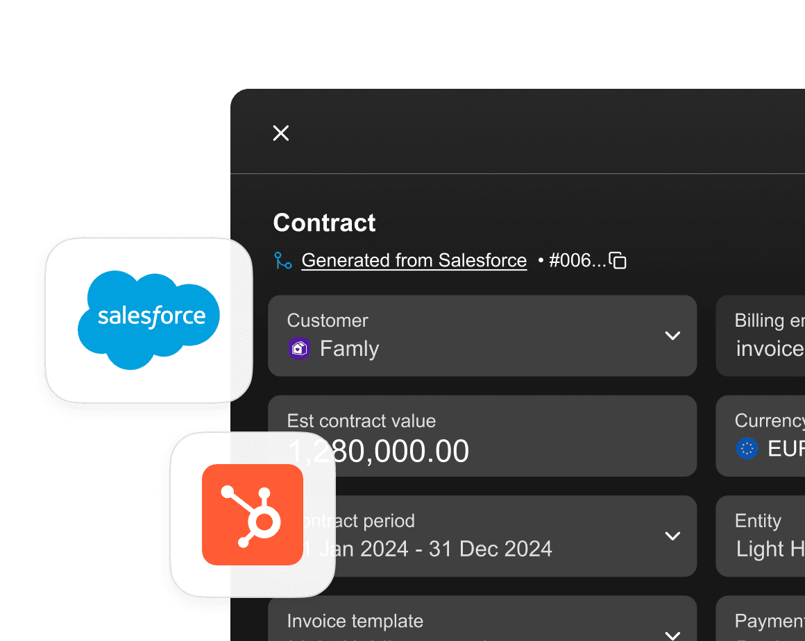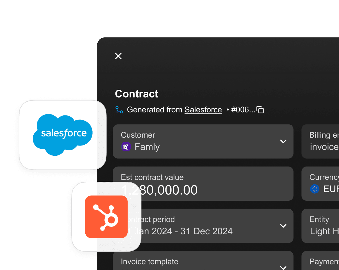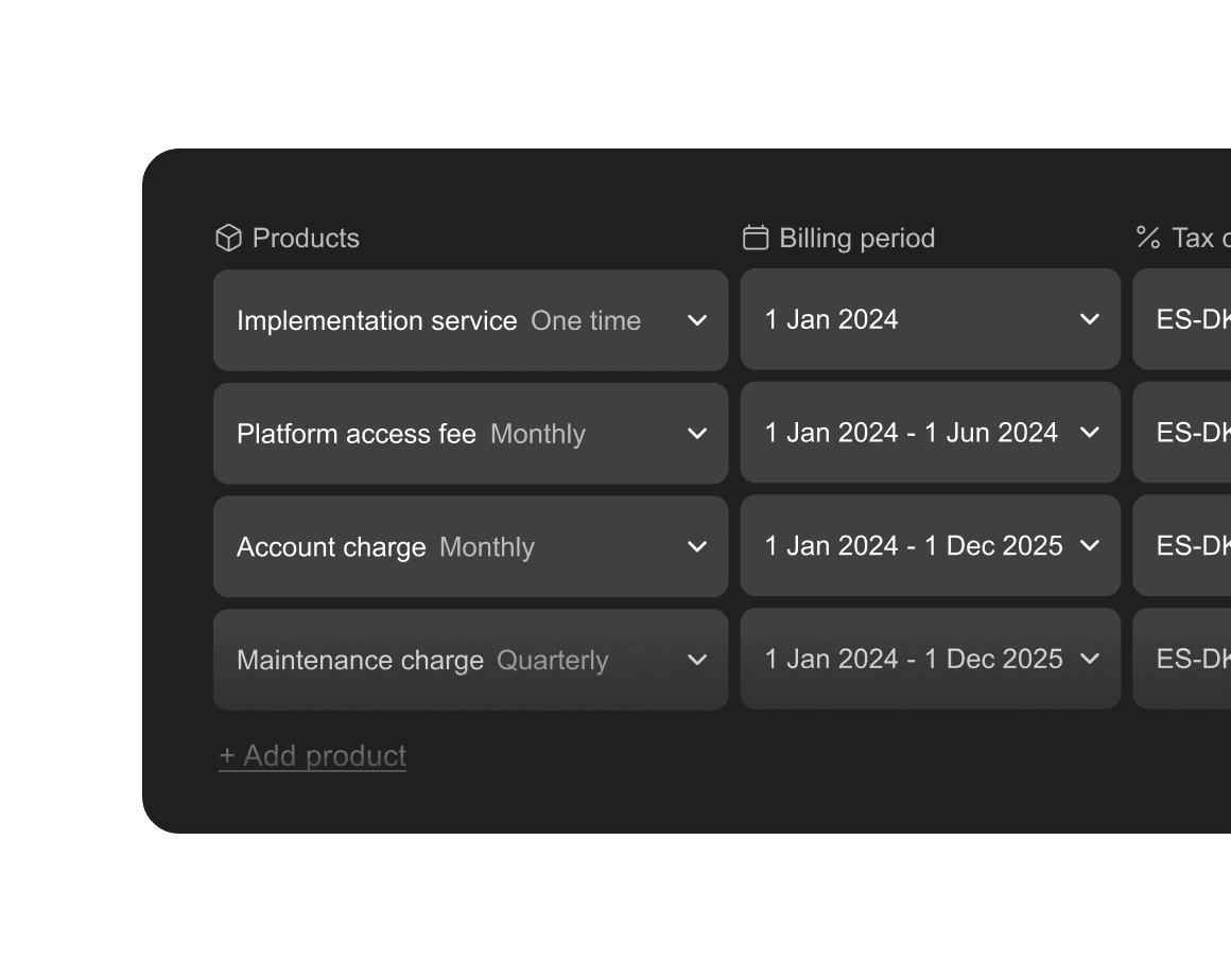 Create contracts via Salesforce/HubSpot or by uploading your contract. Create contracts that combine products of different frequency (e.g. monthly and yearly). Automatically create invoices based on products in multiple currencies. Manage usage-based products via CSV or data lake integration.