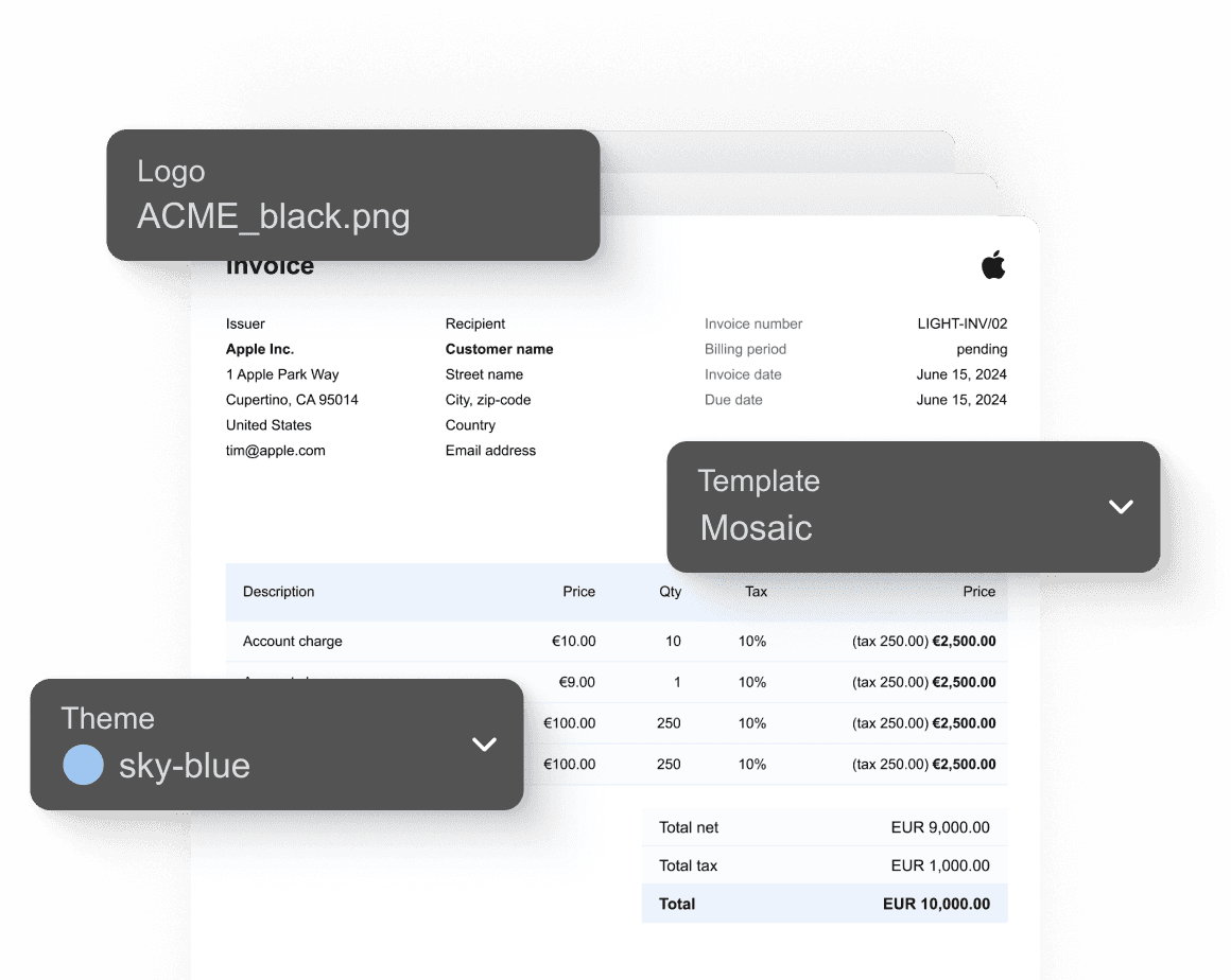 Shine on every invoice. Customize templates with your logo and colors for a branded look. Create unique designs for specific uses.