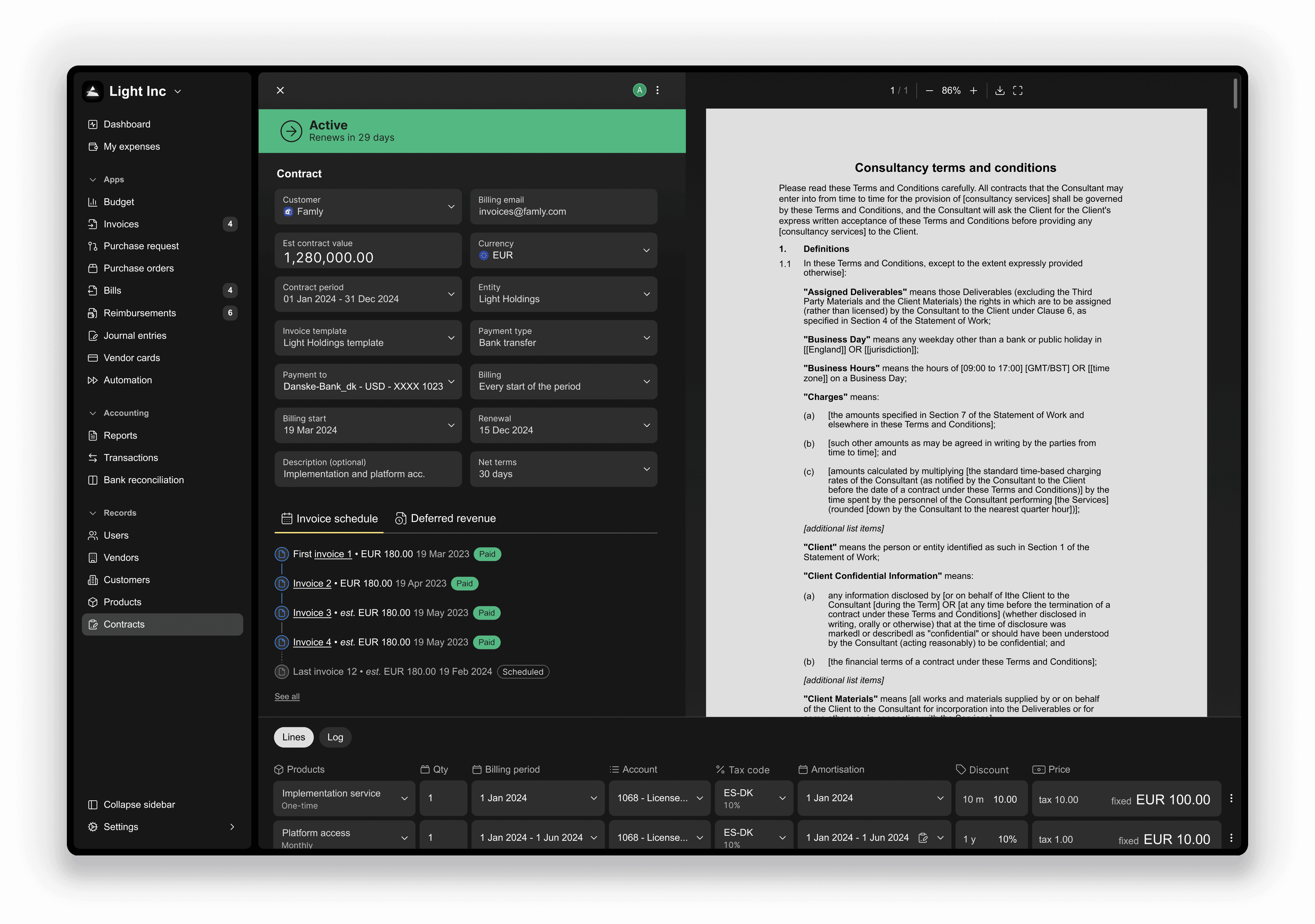 With Light assistant, setting up your invoice schedule is a breeze. Just upload the contract, and it swiftly extracts all vital information about billing schedules and other terms, creating a customized schedule in no time.